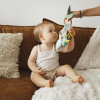 A complete toy that entertains your baby for hours. It has many activities to discover and stimulates your baby’s senses, such as different materials and textures, a transparent rattle, a teething ring, crinkling leaves, and a bell. All activities are attached to a light wooden ring that can be easily grasped by small baby hands, which makes it very convenient. Your baby plays with the activities by sliding them along the ring, helping to develop their motor skills. Practical: some activities are removable for easy cleaning.
